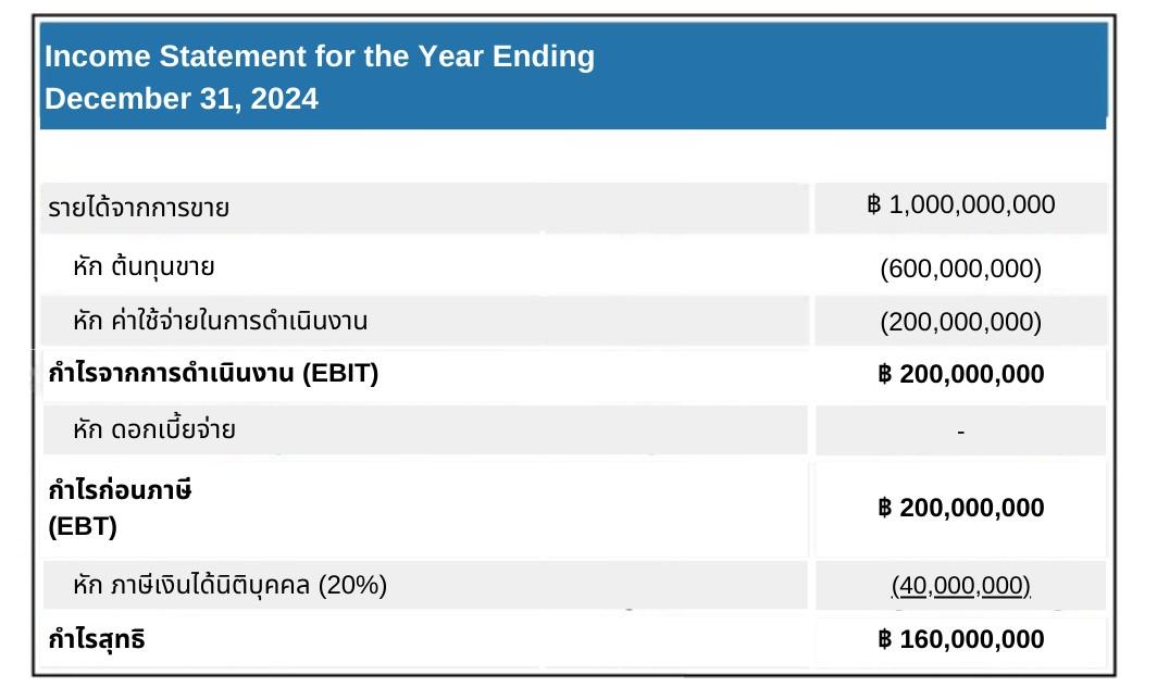 EBIT = 1,000 – 600 – 200 = 200 ล้านบาท